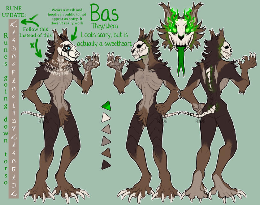 | Bas is a combination of several anatomies including mammalian, equestrian, and even draconic. ✧⋄⋆⋅⋆⋄✧⋄⋆⋅⋆⋄✧ The runes on their torso read: "You are more than your body" in Abyssal. While they are usually hidden, Bas sometimes likes revealing them as a comfort. ✧⋄⋆⋅⋆⋄✧⋄⋆⋅⋆⋄✧ Bas loves horror, but is also tends to hide behind their fingers. |